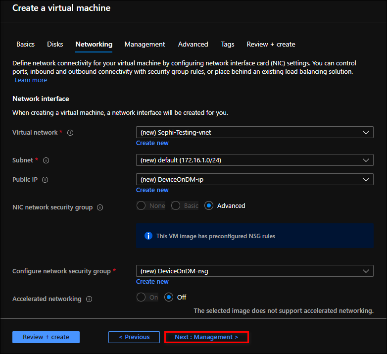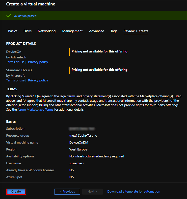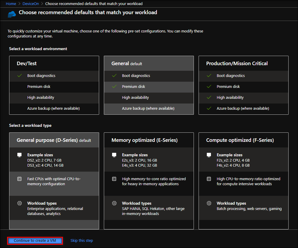 This page includes our recommended configuration for DeviceOn Server, you can just click on Continue to create VM, following the default setting.