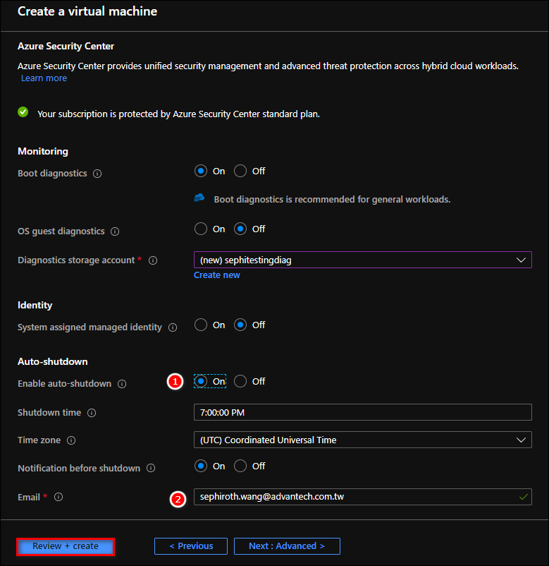 Basically, you can click Review + Create if you don’t need advanced setting. VM will be validating and creating within 5 minutes.