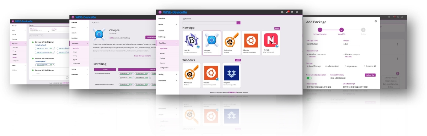 App Store is an enhanced OTA software update feature which presented in a familiar mobile management user interface to provide users with the ability to manage their own exclusive applications and deploy them to remote devices in a simple way. App Store is divided into two modes of operation. IT administrators could use DeviceOn portal to customize, upload, manage apps and schedule installation to designated devices, which we call the manager mode. Second, in the client mode, the App Store application is built-in the device side, and the device can instantly update the applications.