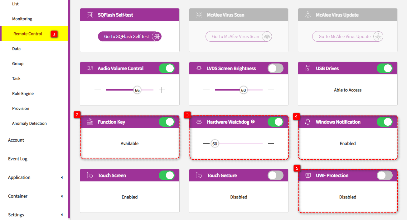 Step 4: Now back to DeviceOn portal. Click βDeviceβ menu item, then βRemote Controlβ tab. And choose proper account, group, and device from βSELECT ACCOUNTβ, βSELECT DEVICE GROUPSβ, and βSELECT DEVICEβ fields accordingly. You can see βFunction Keyβ, βUWF Protectionβ control buttons there. Also, other than these two mentioned, βWatchdog Protectionβ, βWindows Notificationβ and more relevant features are available as you can see.