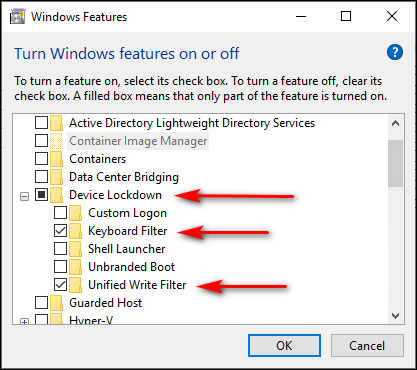 Step 3: Scroll down the window, find and open the βDevice Lockdownβ item. Make sure both βKeyboard Filterβ and βUnified Write Filterβ are checked. Then click βOKβ.