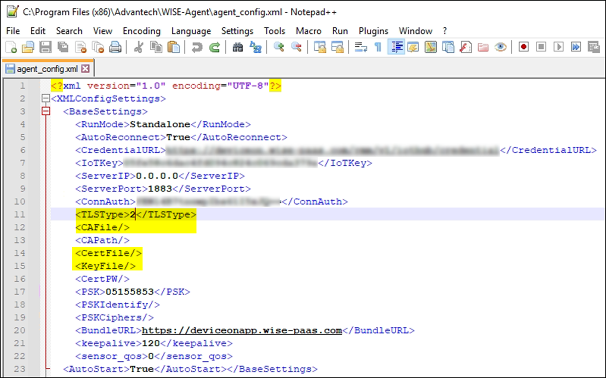 Step 3: Open agent_config.xml with your familiar editor. There are four tags which you should adjust. They are TLSType, CAFile, CertFile and KeyFles.