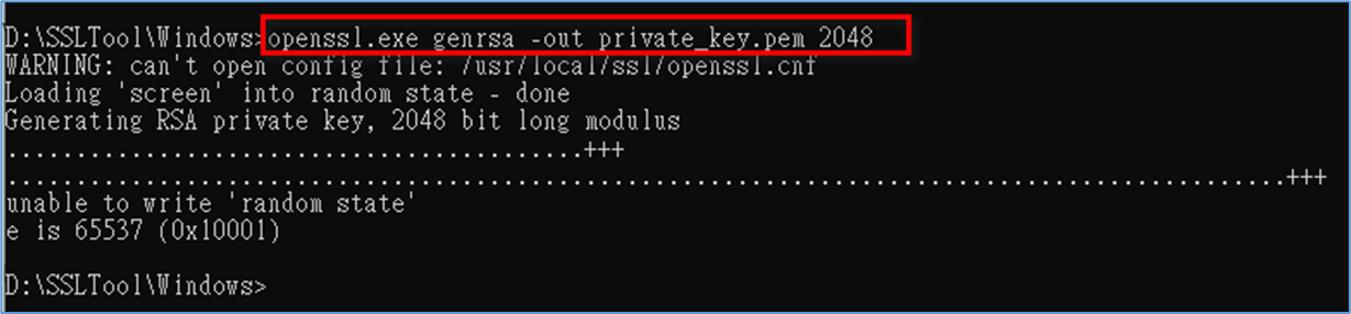 openssl.exe genrsa –out private_key.pem 2048