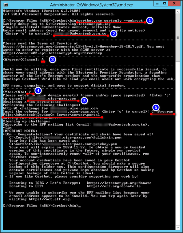 Run the following command to create credential files and enter your website information. The domain name(s) should input yours and the webroot to \DeviceOn Path\server\portal\