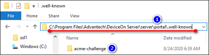 Create the folder named acme-challenge under <DeviceOn Folder>\server\portal.well-known. If the folder “.well-known” is not exist, please create it manually (via CLI, for example: mkdir).