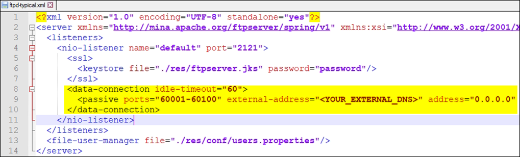 <passive ports="60001-60100" external-address="<YOUR_EXTERNAL_DNS>" address="0.0.0.0" />