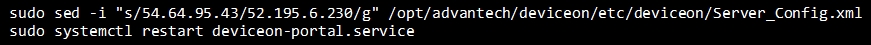 sudo sed -i "s/CURRENT_IP/NEW_IP/g" /opt/advantech/deviceon/etc/deviceon/Server_Config.xml sudo systemctl restart deviceon-portal.serviceExample: