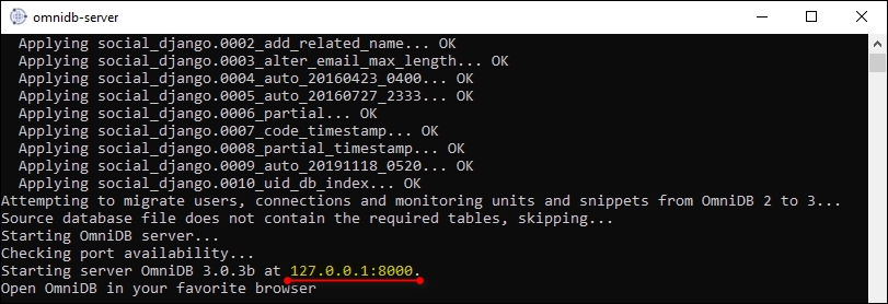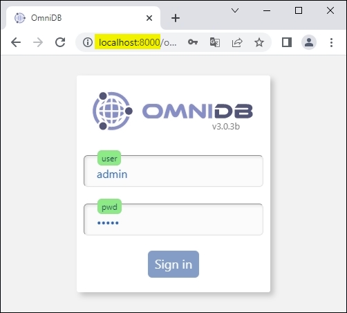 The defaut port of omnidb-server is 8000, and user/pwd is admin/admin.