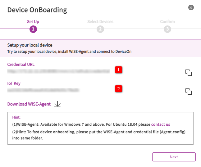The credential URL and IoT Key is the key information for device connection, please copy βCredential URLβ and βIoT Keyβ during the DeviceOn Agent installation. Also, you cloud refer the DeviceOn Agent Installation for details and steps.