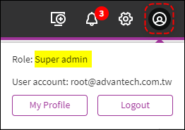 Click the account icon to show the currently logged in account and respective role. For more information, click βMy Profileβ to open the account page. (Menu -> Account). Click βLogoutβ to log out from DeviceOn and remove personal information like cookies or tokens.