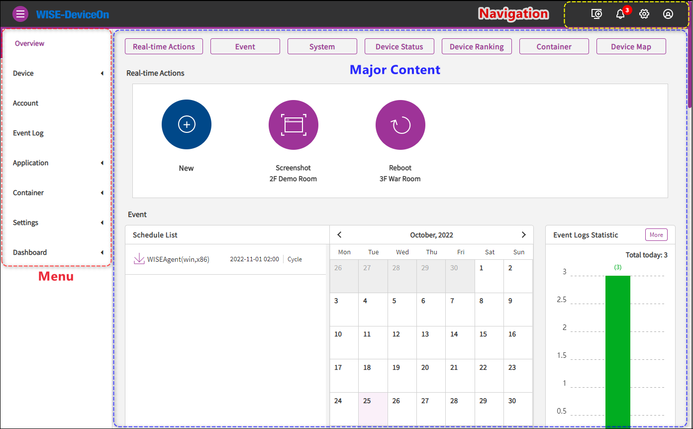 The DeviceOn web interface is based on the VUE framework and leverages the Vuestic Admin template. The user interface is divided into three main parts: the navigation bar at the top, the menu bar at the left and the main content in the center with.