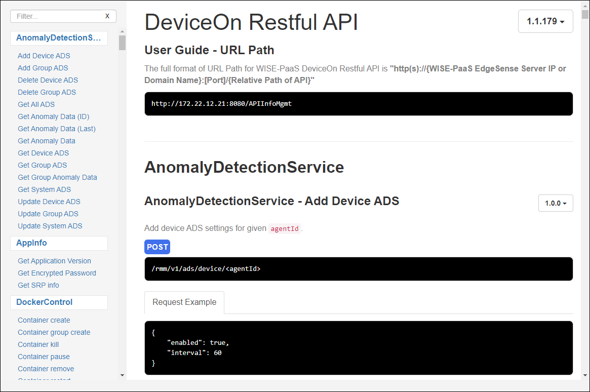 DeviceOn provide hundreds of API for App engineer to build up their AIoT solution, through the APIs to get account, map, device data, and remote diagnostic on devices. The API document is generated by APIDoc, includes API method, request, response, header and testing.