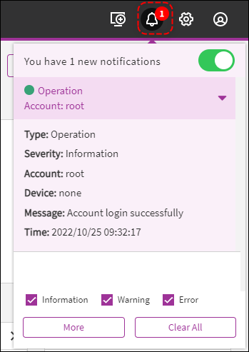 If there are any active notifications, the number of event log messages is shown on the notification icon. Click the notification icon to see the event message summary. Three levels of events are supported: βInformationβ, βWarningβ and βErrorβ, and the user can select which type of events should be shown on the user interface. For example, clicking the βUnsubscribe Notificationβ would disable any events in the screenshot shown below. Please note that after disabling events, the UI will not refresh automatically but needs to be refreshed manually. Click βMoreβ to open the event log page (Menu -> Event Log)