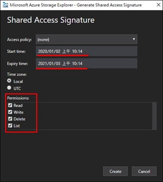 Get container’s SAS token via Azure Storage Explore, please make sure your permission (Read, Write, Delete, List) and valid period (Start and Expiry time)