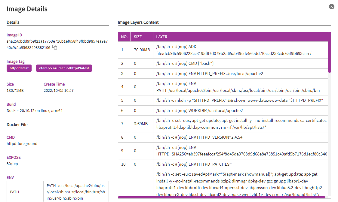 Details of the image, including layer of content, environment variable Tag, ID, etc.