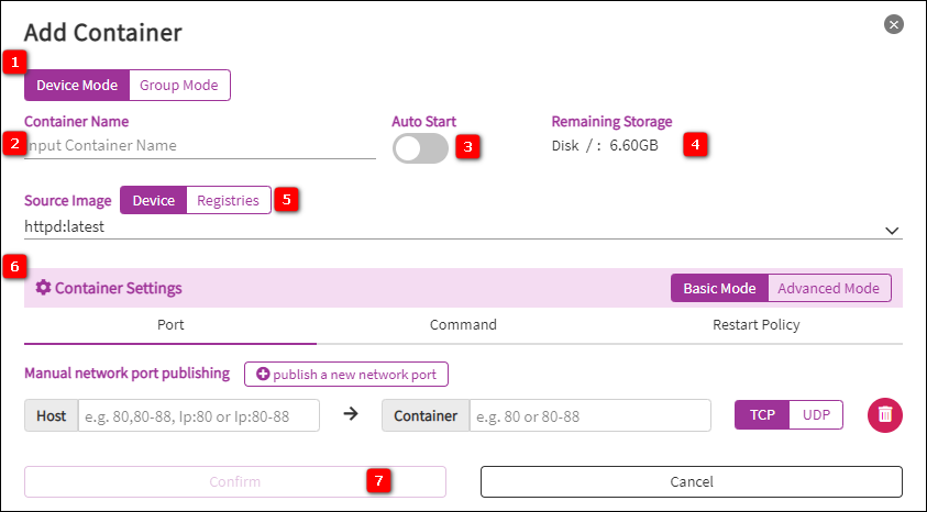 Container Settings: Parameter settings for container startup, such as port mapping, command, etc.