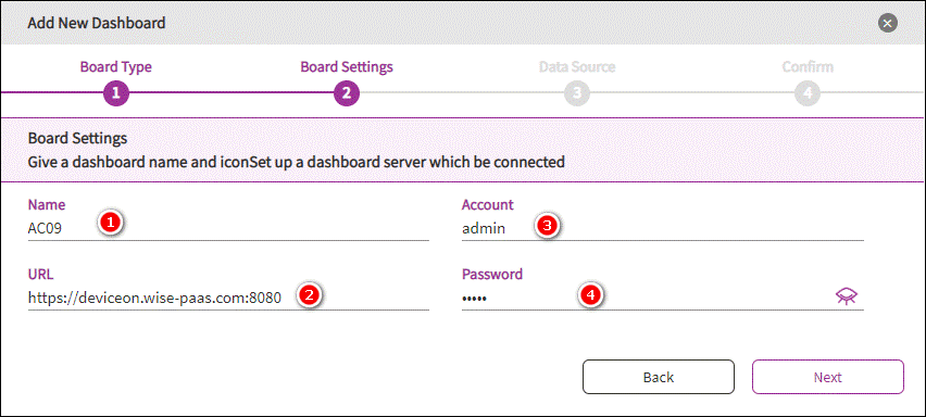 Enter your board name, Grafana URL, account and password. (Default account and password is “admin”)
