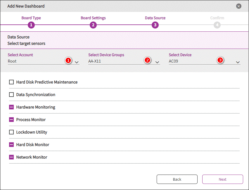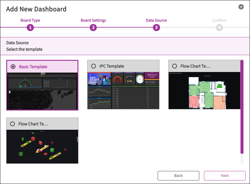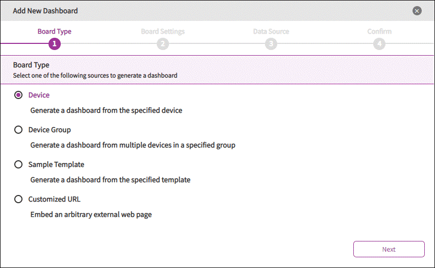 Here, DeviceOn support 4 types of board, select one of method to generate your dashboard. Device, device group, mode or select our default template to generate. Last, embed an arbitrary external web page